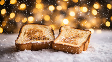 Two freshly toasted bread slices rest on a snowy surface, surrounded by a dreamy bokeh of warm lights, evoking cozy winter warmth and festive vibes.