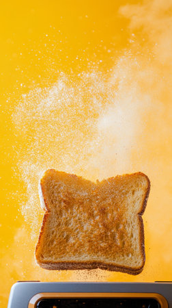 Toasted bread slice popping out of toaster with orange backdrop, breakfast preparation concept
