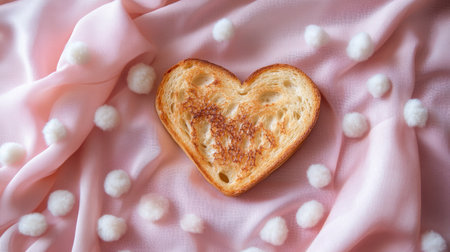 Heart-shaped toast on pink fabric with white pom-poms, romantic breakfast concept