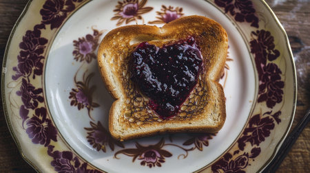 A heart-shaped toast with jelly on a plate. The plate is decorated with flowers and the toast is placed on top of it
