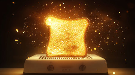 A captivating image of a slice of bread toasting, surrounded by sparkling effects in a modern kitchen setting. Perfect for food-related themes.