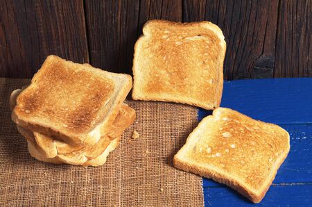 Slices of toasted bread on blue wooden table close up
