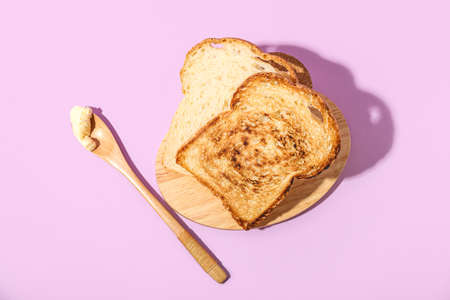 Wooden board of toasts and spoon with butter on pink background