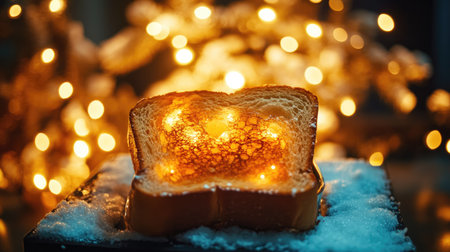 A beautifully toasted bread slice illuminated with decorative lights rests on a snowy surface, creating a warm and inviting atmosphere perfect for winter celebrations.