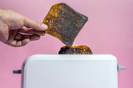 With a frown, a man holds burnt toast, reflecting a rough start.