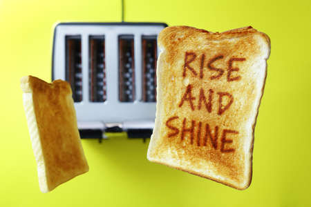 Good morning rise and shine on flying toast or toasted bread popping up from the toaster