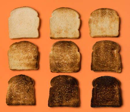 Set of nine toasted bread aligned symmetrically on a green table. Slices of bread, from unroasted to burned up, top view on a green background.