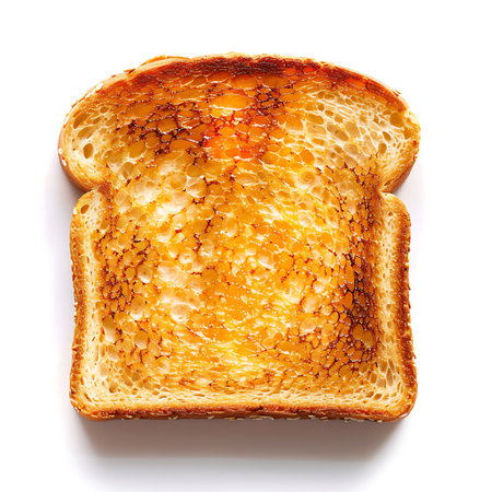 A macro shot of a buttered slice of toast with golden-brown edges, set on a white background, capturing the simplicity and comfort of a classic breakfast.