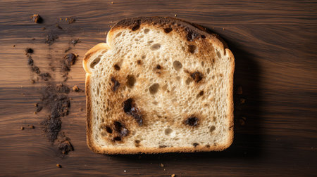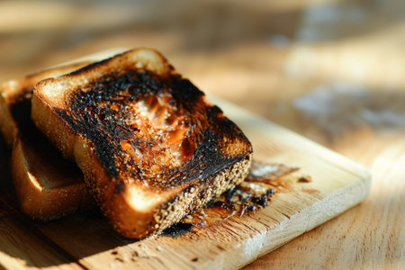 Two charred pieces of toast rest on a light wooden backdrop, accentuating the stark contrast with their dark, crunchy crusts
