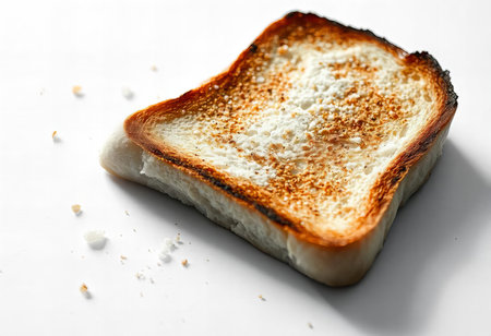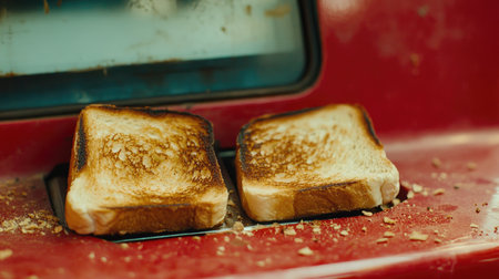 A slice of toast mid-pop in a retro toaster, crumbs scattered, capturing a classic morning breakfast vibe.