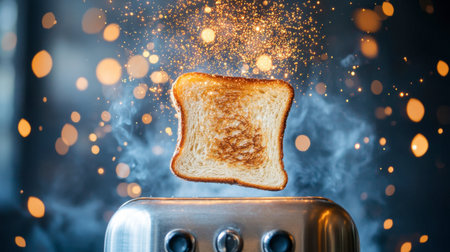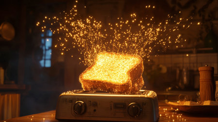 A mesmerizing image of toast popping from a toaster, surrounded by sparkling light. This cozy kitchen scene captures the joy of breakfast preparation in a warm atmosphere.