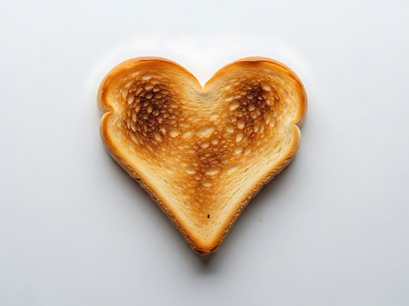 A single slice of bread toasted to a golden brown, cut into a heart shape, resting on a plain surface. The toast has a slightly crispy exterior with a soft interior, making it a delightful and romantic breakfast item.
