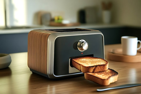 Two slices of toasted bread popping up from a modern toaster, resting on a wooden table in a cozy kitchen, creating an inviting scene for a delightful breakfast
