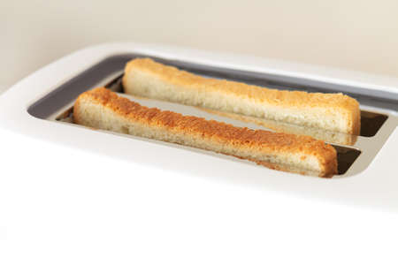 Finished toasts jump out of the toaster. Bread toasted close-up. Breakfast ready. Electrical appliance in the kitchen