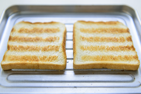 Fried white bread toast on the toaster, background
