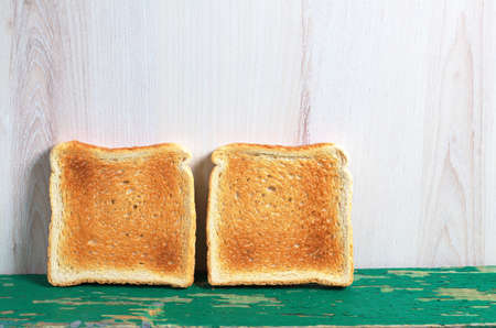 Two slices of toast bread on old green wooden table. Space for text
