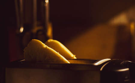 A couple of crusty toasts in the toaster, close-up. Different focus