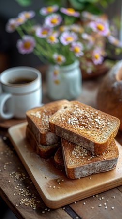 Slices of bread with sesame seeds and cup of coffee