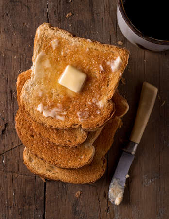 Crusty buttered toast slices on a rustic tabletop with coffee.