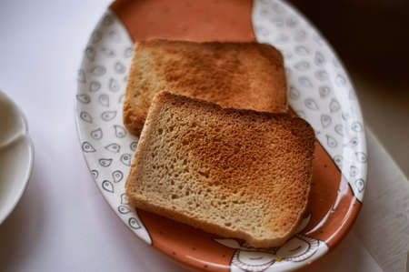 The theme of the Breakfast. Crispy crispy toast on the plate. Macro