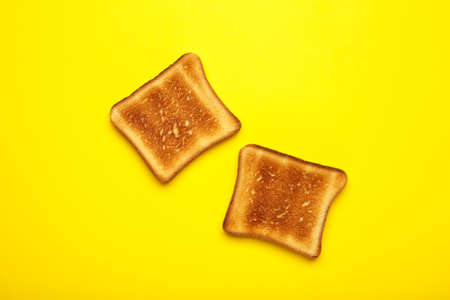 Two toast bread on a bright yellow background. Top view