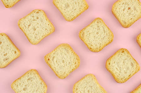 Pattern of square bread croutons on a pink background, top view