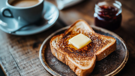 A close-up of perfectly golden toast with butter melting on top, placed on a rustic wooden table alongside a cup of coffee and a small jar of jam.