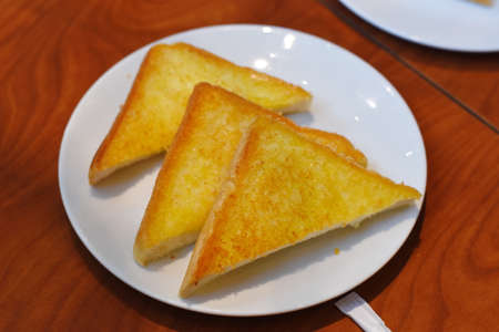 Slices of toast bread on a white plate on a wooden table