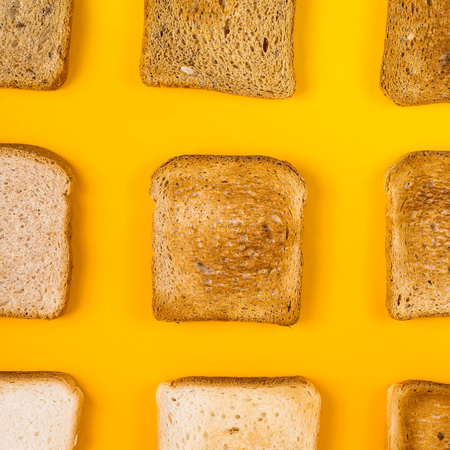 Toast bread on a bright yellow background. Top view