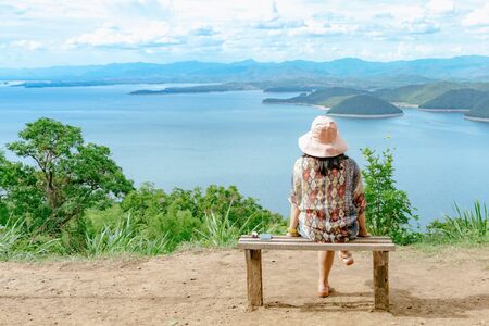 Back view of woman enjoy with beautiful scenery view of nature with a large reservoir above the Srinagarind Dam at Rai Ya Yam view point in Si Sawat District, Kanchanaburi Thailand.