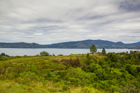 Panorama of lake Toba on the island of Sumatra, wieved from the road towards Medan on a cloudy day. Trees in the foreground.