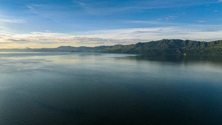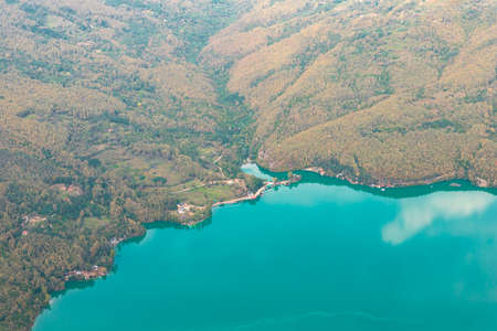 Aerial view of lake Toba in Sumatra among the mountains. Sumatra, Indonesia.