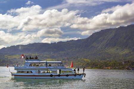 Parapat, Indonesia - January 2, 2020. Pleasure boat goes on the water against the backdrop of mountains and sky with clouds on a sunny day