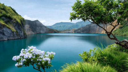 Kelimutu lake showing calm blue water surrounded by lush mountains and green foliage