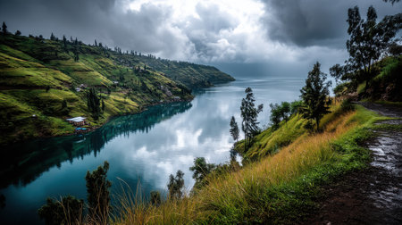 A stunning view of a tranquil lake reflecting the surrounding lush hills under a dramatic sky. The serene atmosphere invites exploration and appreciation of nature's beauty.