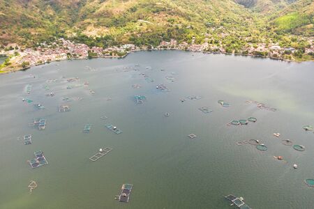 Fish farm with cages for fish and shrimp on the lake Taal, top view. Fish cage for tilapia, milkfish farming aquaculture or pisciculture practices. Philippines, Luzon.
