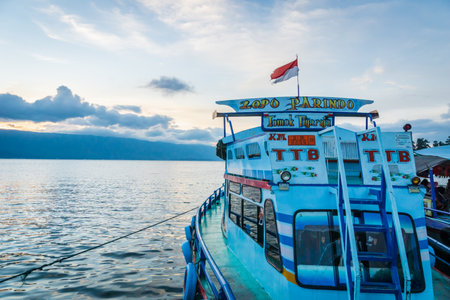 Lake Toba, Indonesia - January 2018: Ferries for passengers on Lake Toba at sunset, North Sumatra Indonesia. Lake Toba is a popular tourist destination
