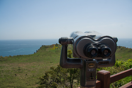 Observation binoculars on the pier and Sokcho city on the background, South Korea