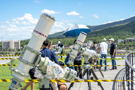 Chiang Mai, Thailand - June 21, 2020 : Partial solar eclipse, People viewing a solar eclipse for staff setting telescope at Princess Sirindhorn AstroPark.