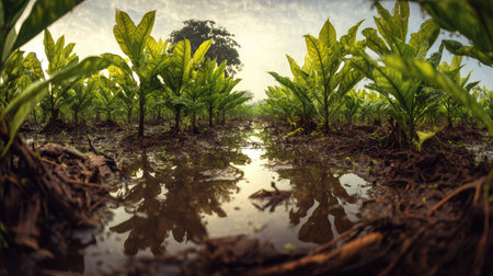 A panoramic wide view of Marang field growing closely together after rain wet leaves reflecting soft light fresh soil visible ultra realistic photography cinematic wide composition lifelike natural scene