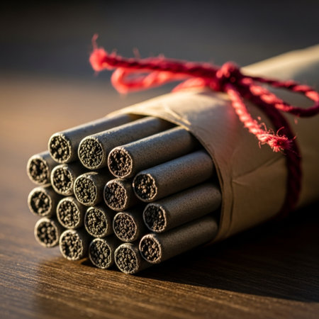 Tobacco leaves rolled and tied in bundles, photographed under soft studio lighting on a dark background.