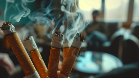 A cigarette is lit and the smoke is rising. Concept of danger and harm, as smoking is known to cause health problems