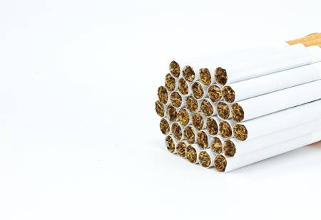 image of several commercially made pile cigarette on white background. or Non smoking campaign concept, tobacco pattern top view.