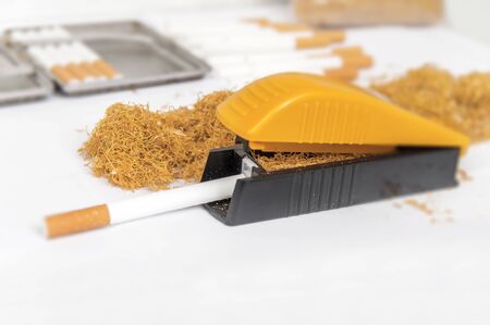 The machine for stuffing cigarettes with tobacco. Empty sighety. Rossypany tobacco on the table. Homemade cigarette production
