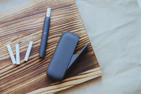 Ukraine, Dnipro - July 02, 2020. pack of cigarettes and iqos electronic cigarettes on a wooden table, addiction and bad habits