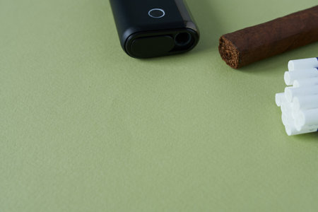 Close-up of a cigar and cigarettes on a green background. Space for text.