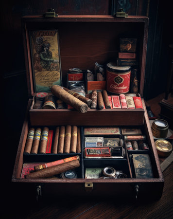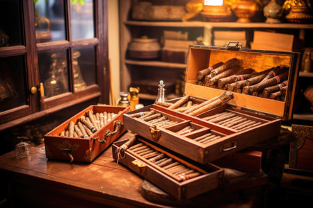 rolled cigars aging in a traditional wooden humidor, created with generative ai