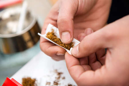 Closeup on the hands of a man just making a tobacco cigarette and a sheet of paper. In the background you can see an ashtray and spilled tobacco.