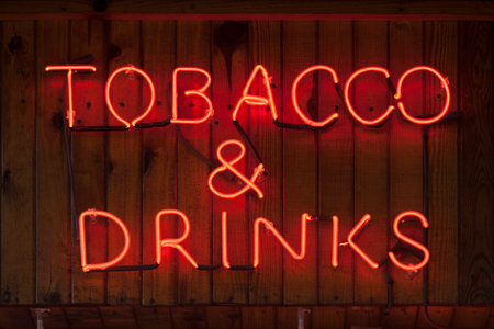 Close-up on a neon light shaped into a the short phrase Tobacco & Drinks.