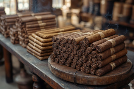Wooden tables are filled with neatly arranged handmade cigars showcasing various shades of brown. The workshop, located in Cuba, is alive with a rich aroma of tobacco, reflecting a time-honored craft passed down through generations.